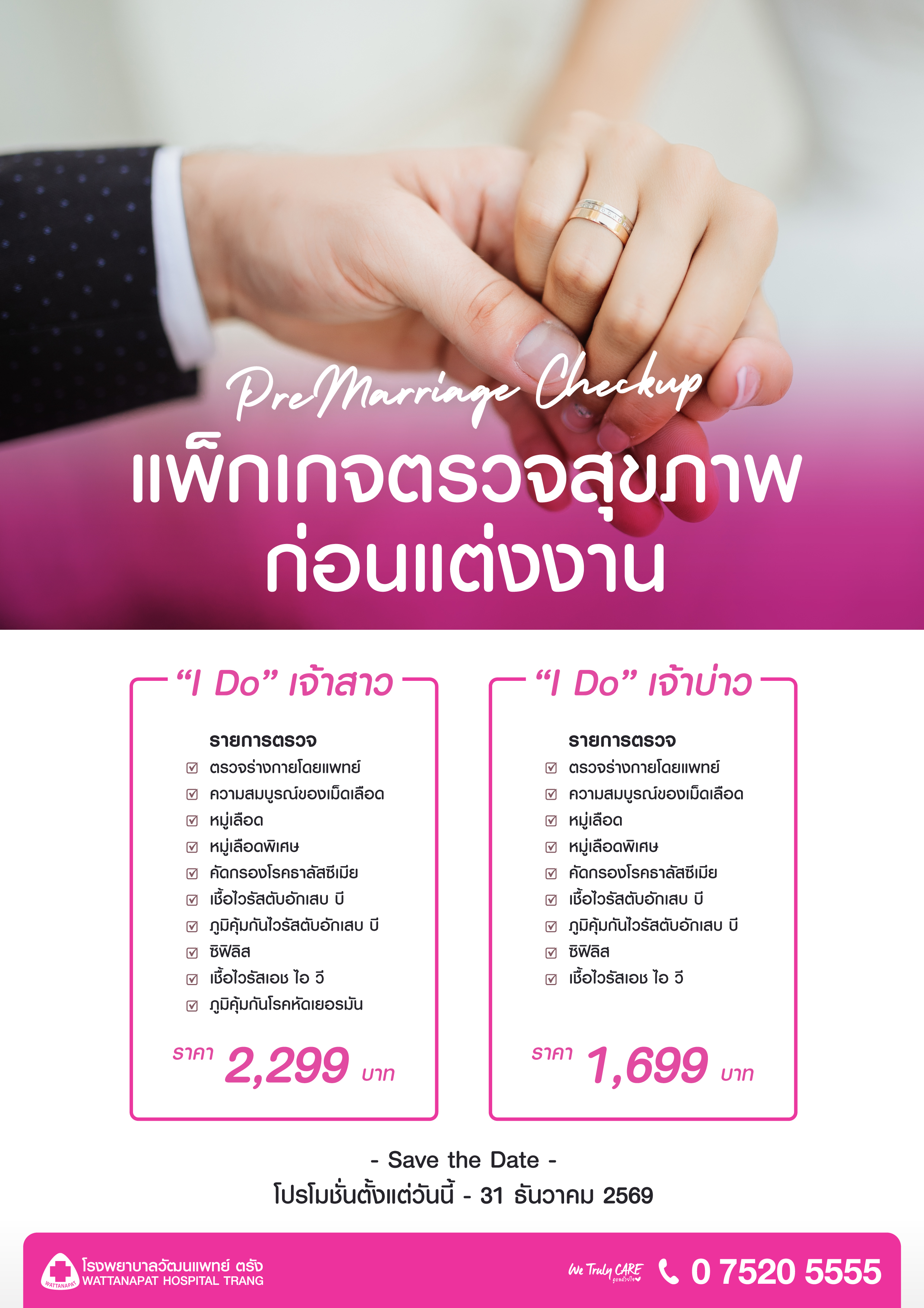 - ตรวจสุขภาพก่อนแต่งงาน สำหรับผู้ชาย (9 รายการตรวจ) ราคา 1,699 บาท