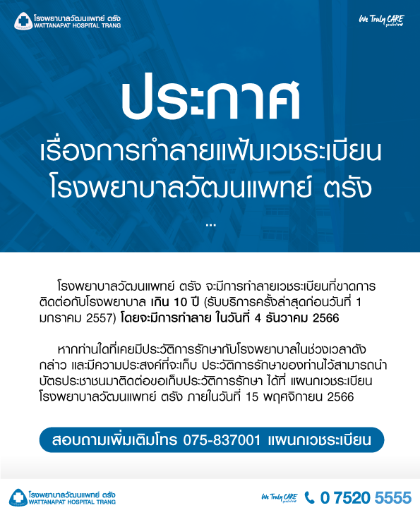 หากท่านใดที่เคยมีประวัติการรักษากับโรงพยาบาล ในช่วงเวลาดังกล่าว และมีความประสงค์ที่จะเก็บประวัติการรักษาของท่านไว้สามารถนำบัตรประชาชน มาติดต่อขอเก็บประวัติ การรักษา ได้ที่ แผนกเวชระเบียน โรงพยาบาลวัฒนแพทย์ ตรัง ภายในวันที่ 15 พฤศจิกายน 2566