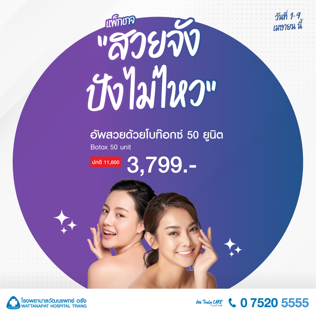 - ฉีดโบท็อกซ์ ลดริ้วรอย หน้าเรียว 50 ยูนิต (Botox 50 Unit) ราคา 3,799 บาท / ปกติ 11,600 บาท