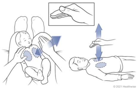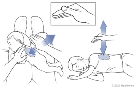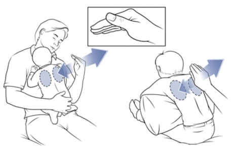 อุ้มลูกให้หันหน้าเข้าหาอกคุณพ่อคุณแม่ ให้ศีรษะลูกพาดบนไหล่พ่อแม่หรือแนนลำตัวในเด็กเล็ก ส่วนเด็กโตนั้นให้นั่งหันหน้าออกจาก พ่อแม่แล้วใช้หมอนหนุนไว้ที่หน้าอกโน้มตัวไปข้างหน้า แล้วเคาะด้านหลังส่วนบนเหนือกระดูกสะบักขึ้นไป หลีกเลี่ยงการเคาะบริเวณกระดูกสะบัก