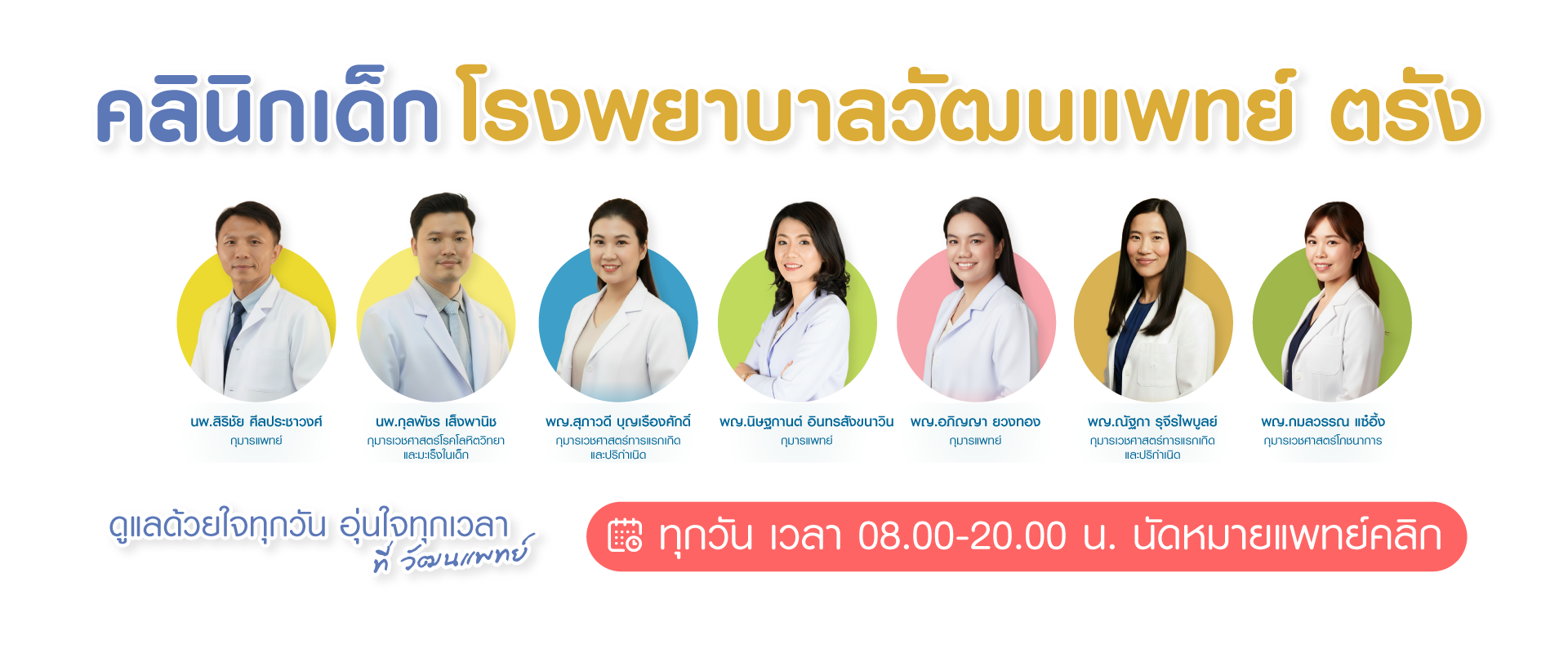 ให้ความสำคัญกับพัฒนาการและสุขภาพของเด็กในทุกช่วงวัย บริการโดยทีมแพทย์ชำนาญการที่มีประสบการณ์ ครอบคลุมการตรวจรักษา การส่งเสริมสุขภาพ การให้วัคซีนตามวัย รวมถึงการให้คำปรึกษาเรื่องการเลี้ยงดูและโภชนาการของเด็กเพื่อการเจริญเติบโตที่สมวัยและปลอดภัย