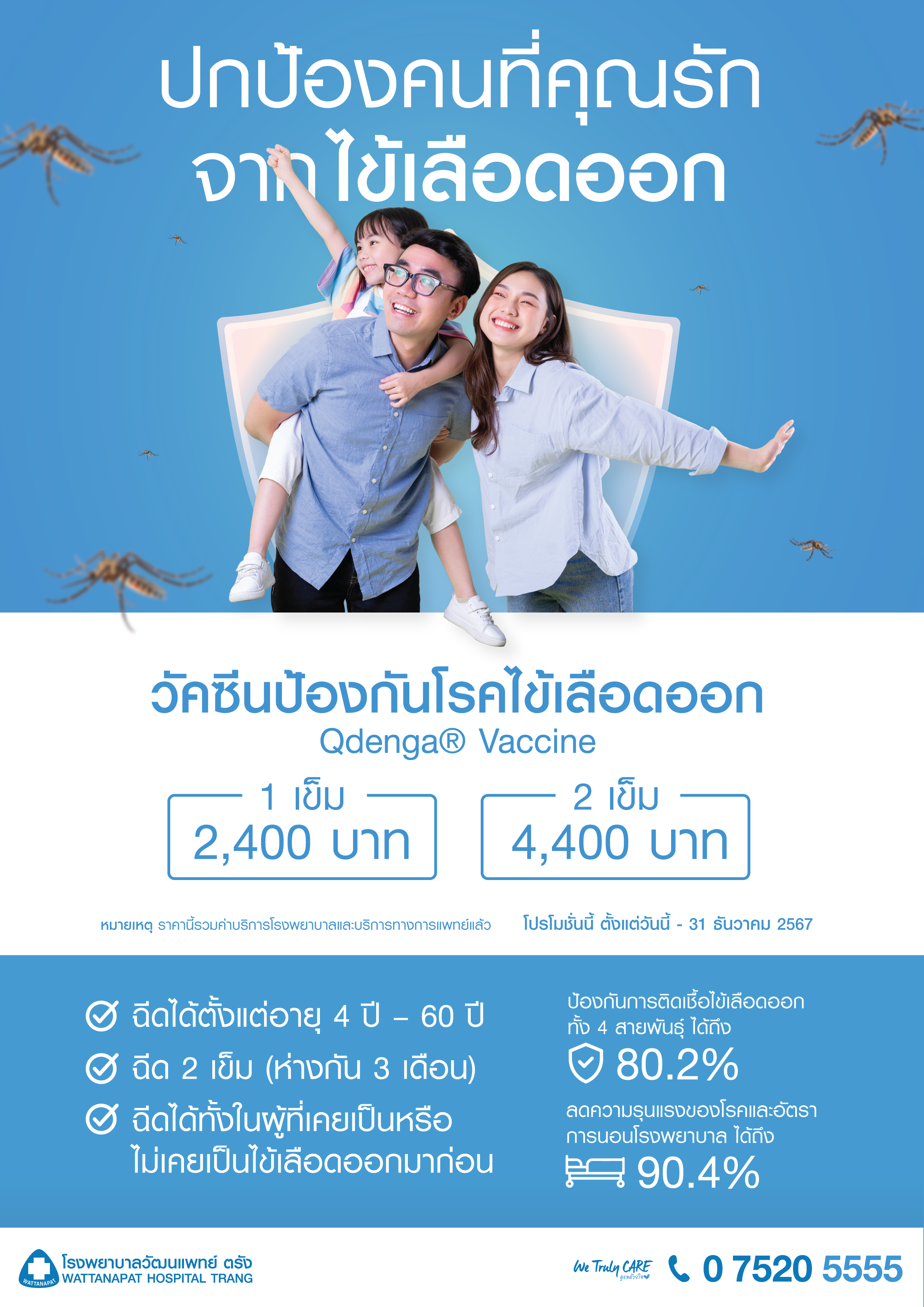 - 5.การฉีดวัคซีนป้องกันโรคไข้เลือดออก 4 สายพันธุ์ ชนิดใหม่ (New 4 serotype dengue fever vaccine) ซึ่งเป็นวัคซีนป้องกันไวรัสเดงกีรุ่นล่าสุดที่ถูกพัฒนาให้สามารถป้องกันได้ครอบคลุมทั้ง 4 สายพันธุ์ โดยสามารถเข้ารับการฉีดได้ตั้งแต่อายุ 4-60 ปี ผู้ที่มีภูมิคุ้มกันร่างกายเป็นปกติ รวมถึงคุณพ่อคุณแม่ ผู้ปกครองที่มีบุตรหลานอายุตั้งแต่ 4 ปี ขึ้นไป สามารถพาบุตรหลานและทุกคนในครอบครัวเข้ารับการฉีดวัคซีนป้องกันโรคไข้เลือดออกได้ที่โรงพยาบาลทุกแห่งที่มีวัคซีนไว้คอยบริการ