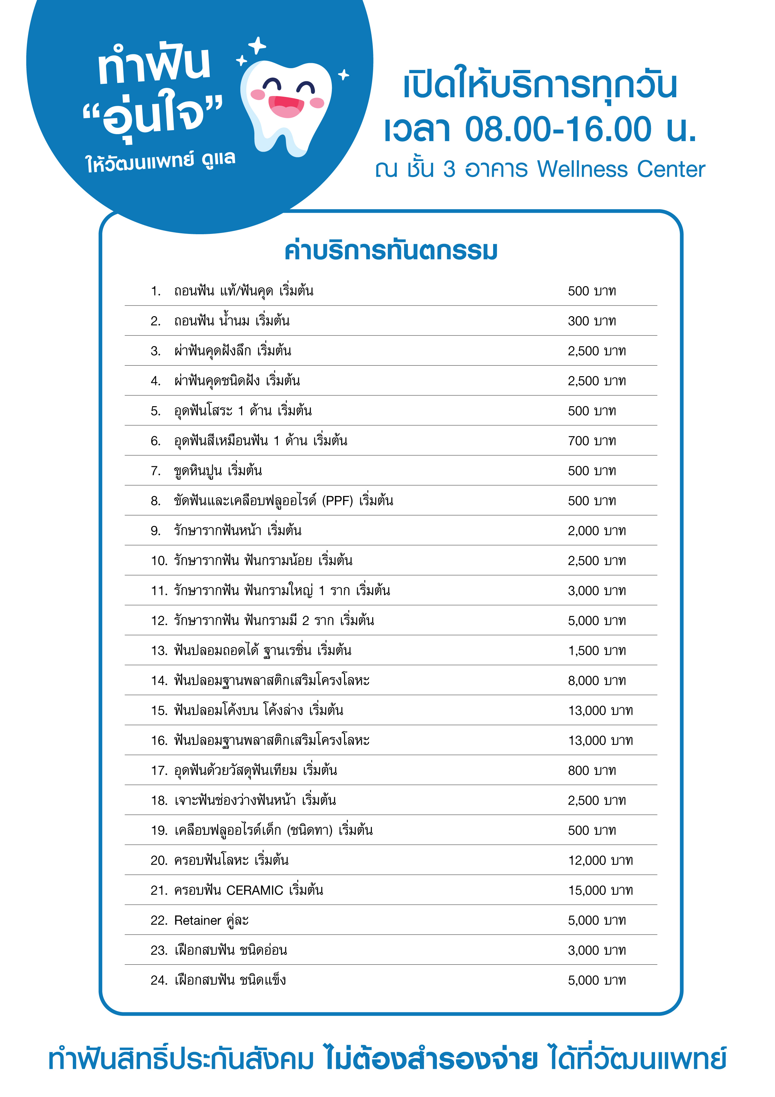 หมายเหตุ: ราคาค่าบริการเป็นราคาเริ่มต้น อาจเปลี่ยนแปลงตามสภาพฟันและดุลยพินิจของทันตแพทย์