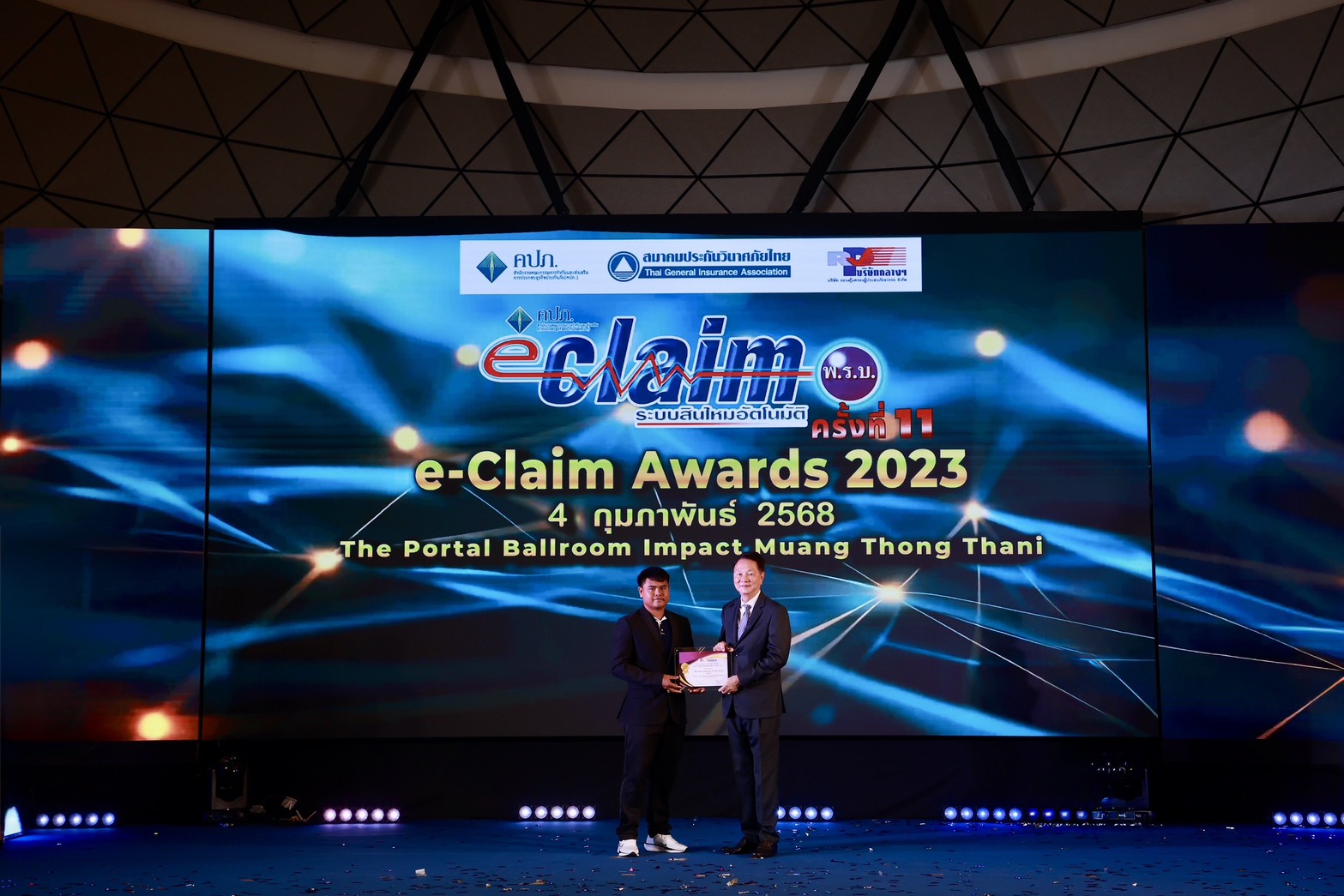 เมื่อวันที่ 4 กุมภาพันธ์ 2568 บริษัท กลางคุ้มครองผู้ประสบภัยจากรถ จำกัด ร่วมกับสำนักงานคณะกรรมการกำกับและส่งเสริมการประกอบธุรกิจประกันภัย (คปภ.) และสมาคมประกันวินาศภัยไทย จัดพิธีมอบรางวัล "e-Claim Awards 2023" ณ ห้อง THE PORTAL BALLROOM ศูนย์แสดงสินค้าและการประชุมอิมแพ็ค เมืองทองธานี จังหวัดนนทบุรี โดยมีนายชูฉัตร ประมูลผล เลขาธิการ คปภ. เป็นประธานในพิธี