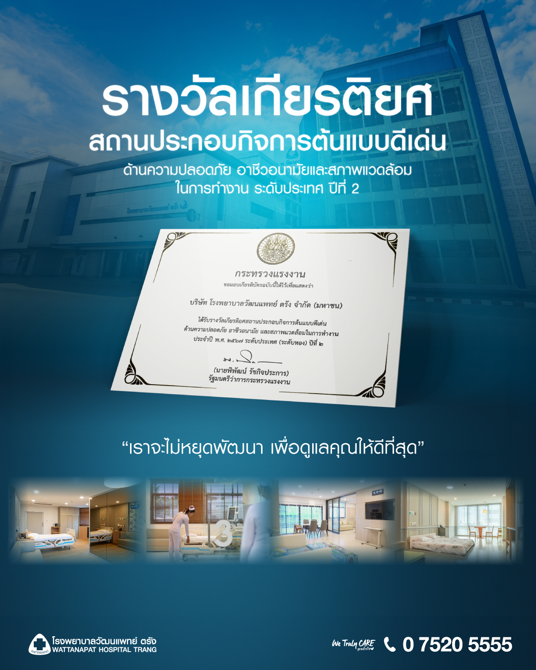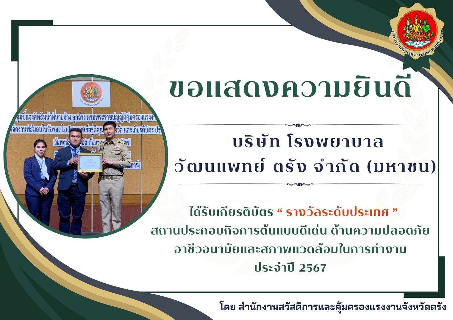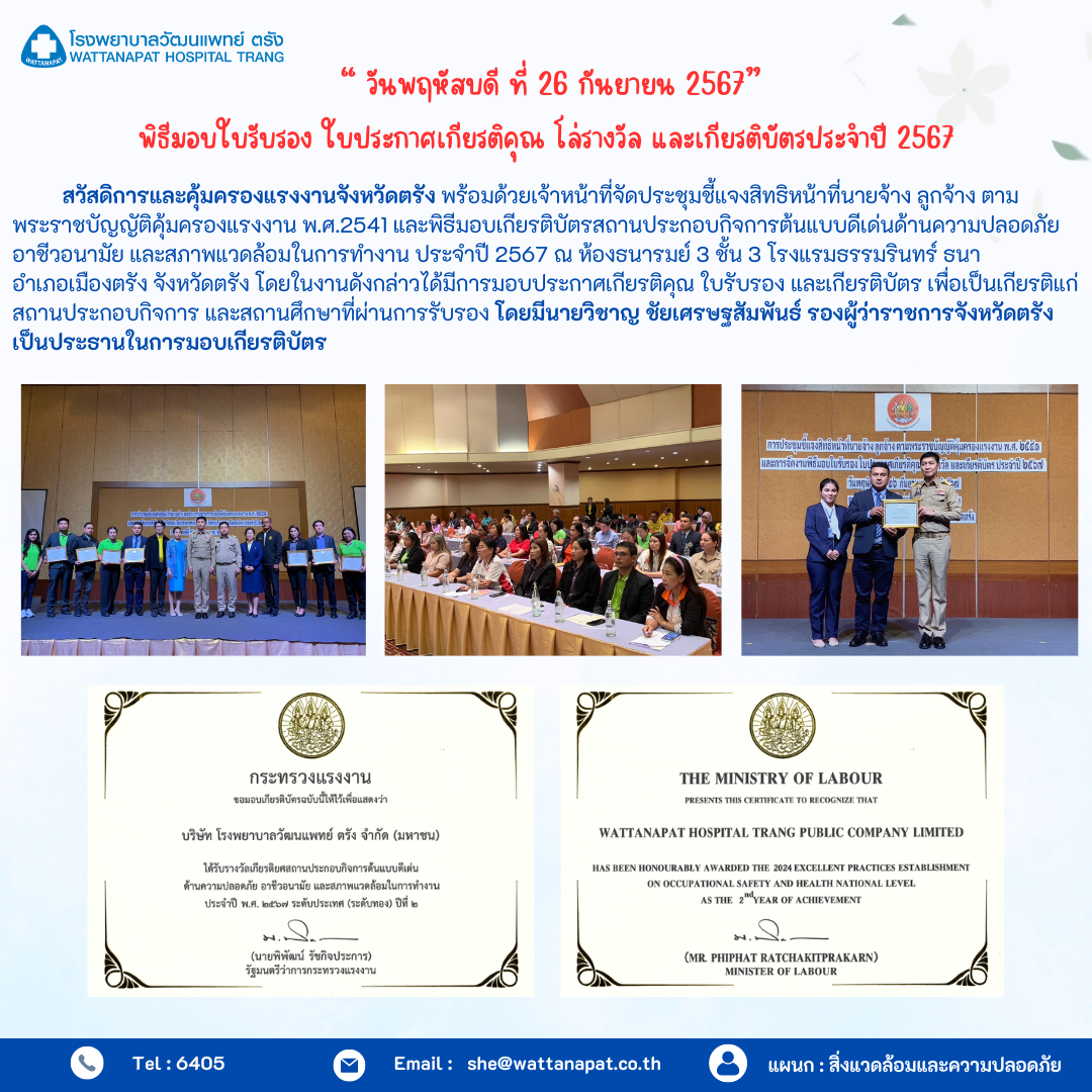 โรงพยาบาลวัฒนแพทย์ ตรัง คว้ารางวัลเกียรติยศ "สถานประกอบกิจการต้นแบบดีเด่น" ด้านความปลอดภัย อาชีวอนามัย และสภาพแวดล้อมการทำงาน ระดับประเทศ ต่อเนื่องเป็นปีที่ 2