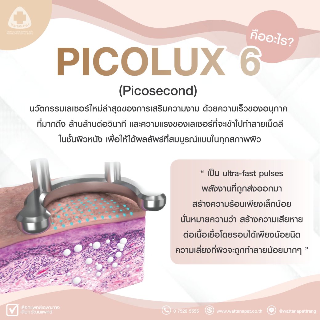 โดยการรักษาด้วยตัวเครื่อง Pico Laser จะเข้าไปทำลายกลุ่มของเม็ดสีให้เกิดการแตกตัวและมีขนาดเล็กลงเรื่อยๆ ทำให้ผลลัพธ์ของการรักษาส่งผลประสิทธิภาพดี เม็ดสีแตกตัวได้อย่างรวดเร็ว กระตุ้นการทำงานของคอลลาเจนใต้ชั้นผิว ทำให้ผิวขาวกระจ่างใส สามารถเห็นผลของการเปลี่ยนแปลงได้ตั้งแต่ครั้งแรกที่เลเซอร์ และใช้เวลาน้อยกว่าการรักษาด้วยเคร่องเลเซอร์ในระบบเดิม