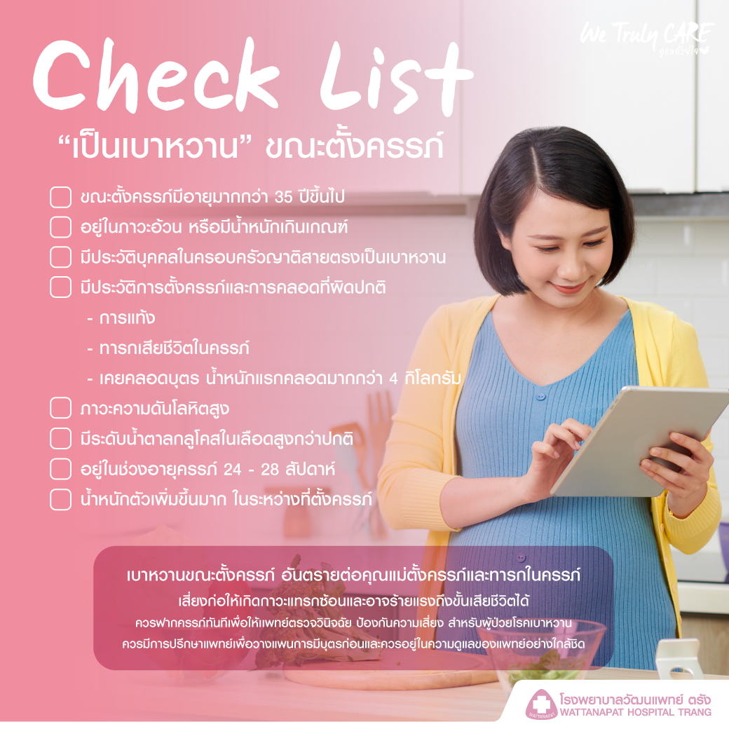 ซึ่งอาการจะให้เคียงอาการตั้งครรภ์ เพราะฉะนั้นสามารถตรวจเช็คได้จากการวัดระดับน้ำตาลในเลือด โดยการเจาะเลือดปลายนิ้วเพื่อประเมิน ที่สำคัญควรมีการตรวจเรื่องเบาหวานตั้งแต่มีการฝากครรภ์ครั้งแรก