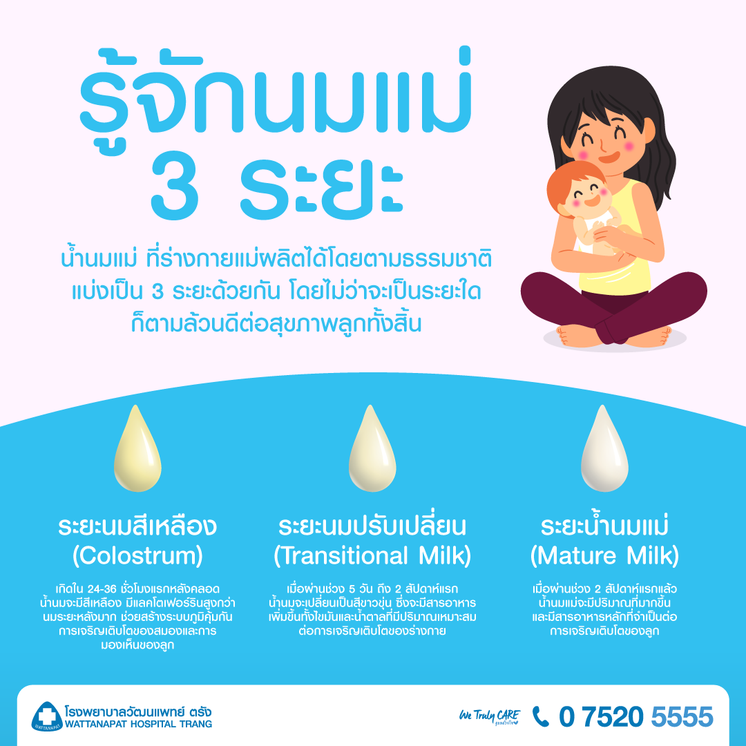 น้ำนมแม่ ที่ร่างกายแม่ผลิตได้โดยตามธรรมชาติ แบ่งเป็น 3 ระยะด้วยกัน โดยไม่ว่าจะเป็นระยะใด ก็ตามล้วนดีต่อสุขภาพลูกทั้งสิ้น ได้แก่