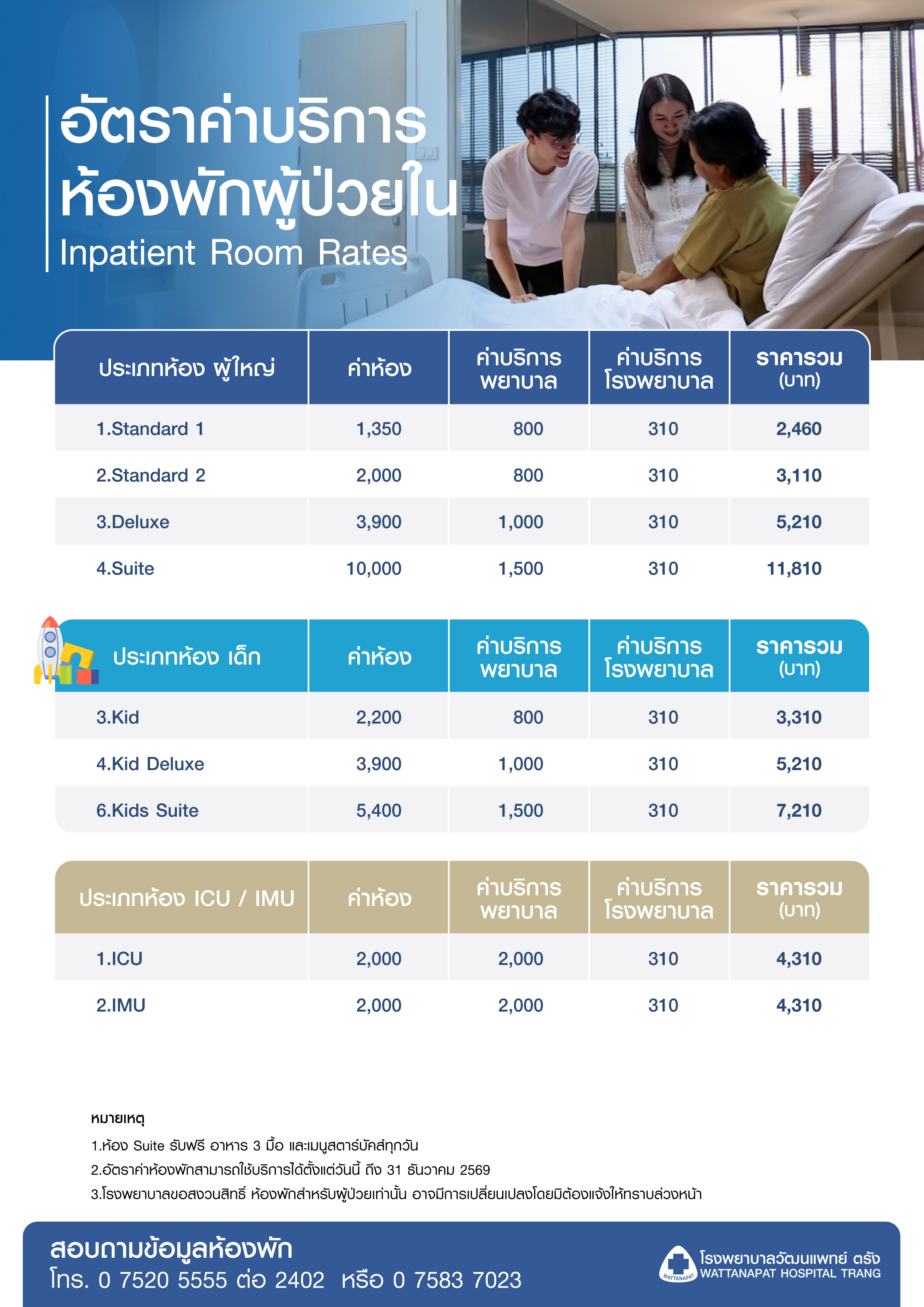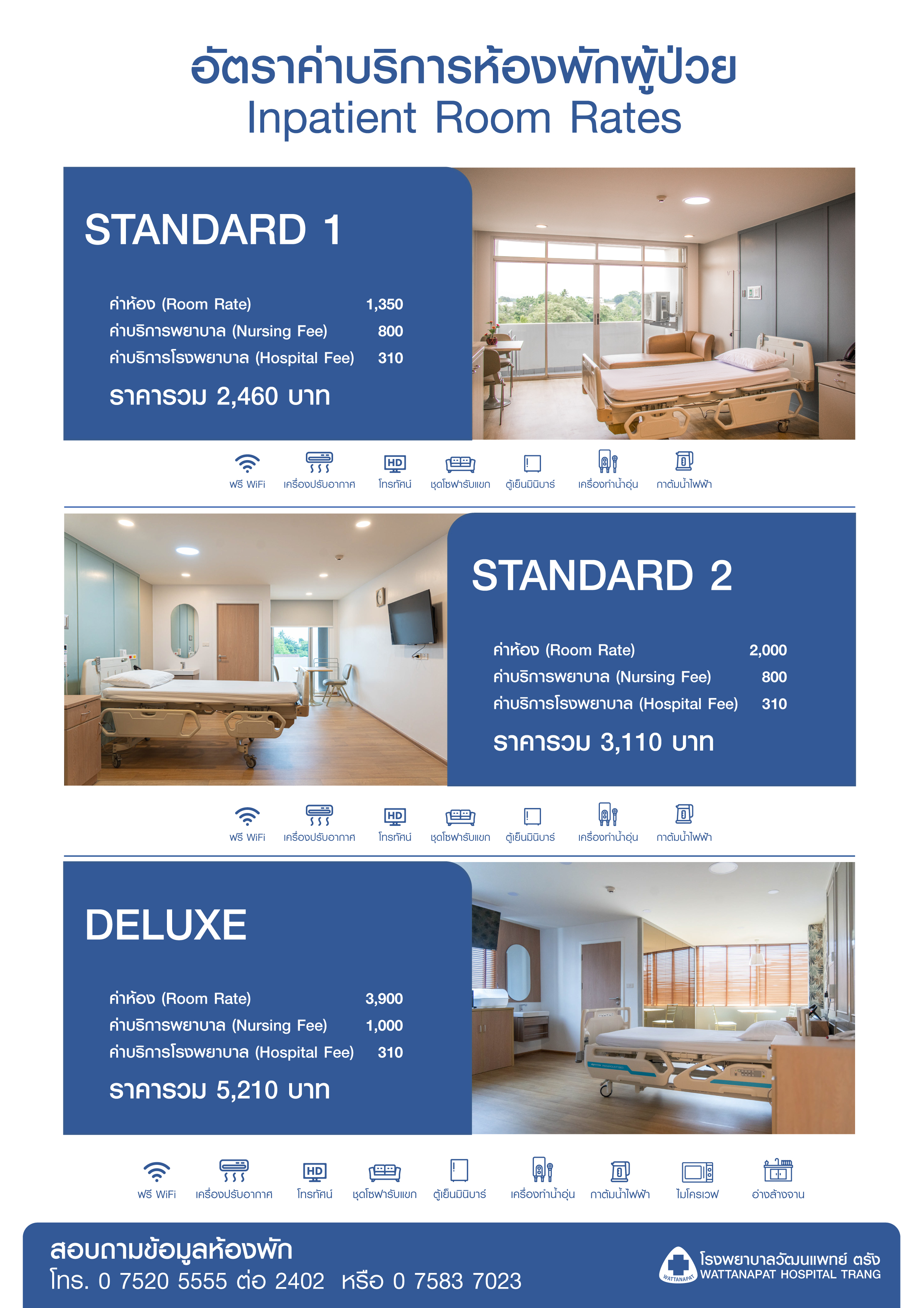 บริการสำหรับผู้ป่วย บริการห้องพักสำหรับผู้ป่วยใน 5 ม.ค. 58 เวลาอ่าน 1 นาที Share โรงพยาบาลวัฒนแพทย์ ตรังได้ออกแบบห้องพักสำหรับผู้ป่วย เพื่อให้ท่านได้รับความสะดวก และความปลอดภัยสูงสุด พร้อมสิ่งอำนวยความสะดวกครบครัน ผู้ป่วยสามารถเลือกพักได้ตามความต้องการ และตามงบประมาณของผู้ป่วย โดยเริ่มตั้งแต่ห้องพักราคาประหยัดไปจนถึงห้องพักแบบ VIP