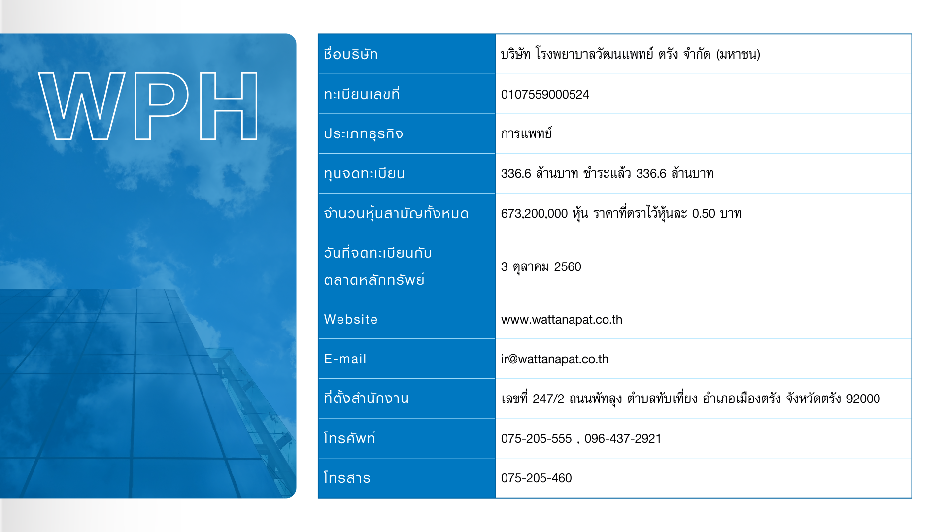 กลุ่มโรงพยาบาลวัฒนแพทย์ ตรัง มีเป้าหมายในการดำเนินธุรกิจที่จะ “มุ่งมั่น สู่ความเป็นผู้นำ ทางการแพทย์เฉพาะทางด้วยคุณภาพและการบริการที่ได้มาตรฐาน” ซึ่งบริษัทได้ยึดมั่นและปฏิบัติตามเสมอมานับตั้งแต่ก่อตั้งบริษัทฯ จึงเป็นที่มาของการให้บริการอย่างมีคุณภาพและการเติบโตของบริษัทฯ เพื่อบรรลุวัตถุประสงค์หลัก (Purposes) ขององค์กรคือ “การเป็นองค์กรที่เติบโตอย่างยั่งยืน” (Sustainable Growth Organization)