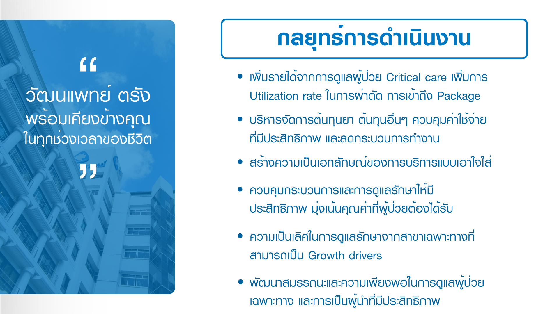 เป็นผู้นําด้านเวชศาสตร์ป้องกัน (ค้นหา คัดกรอง) เชิงรุก เพื่อตอบสนองความต้องการของผู้รับบริการเฉพาะกลุ่ม สร้างการรับรู้และเพิ่มฐานผู้รับบริการ