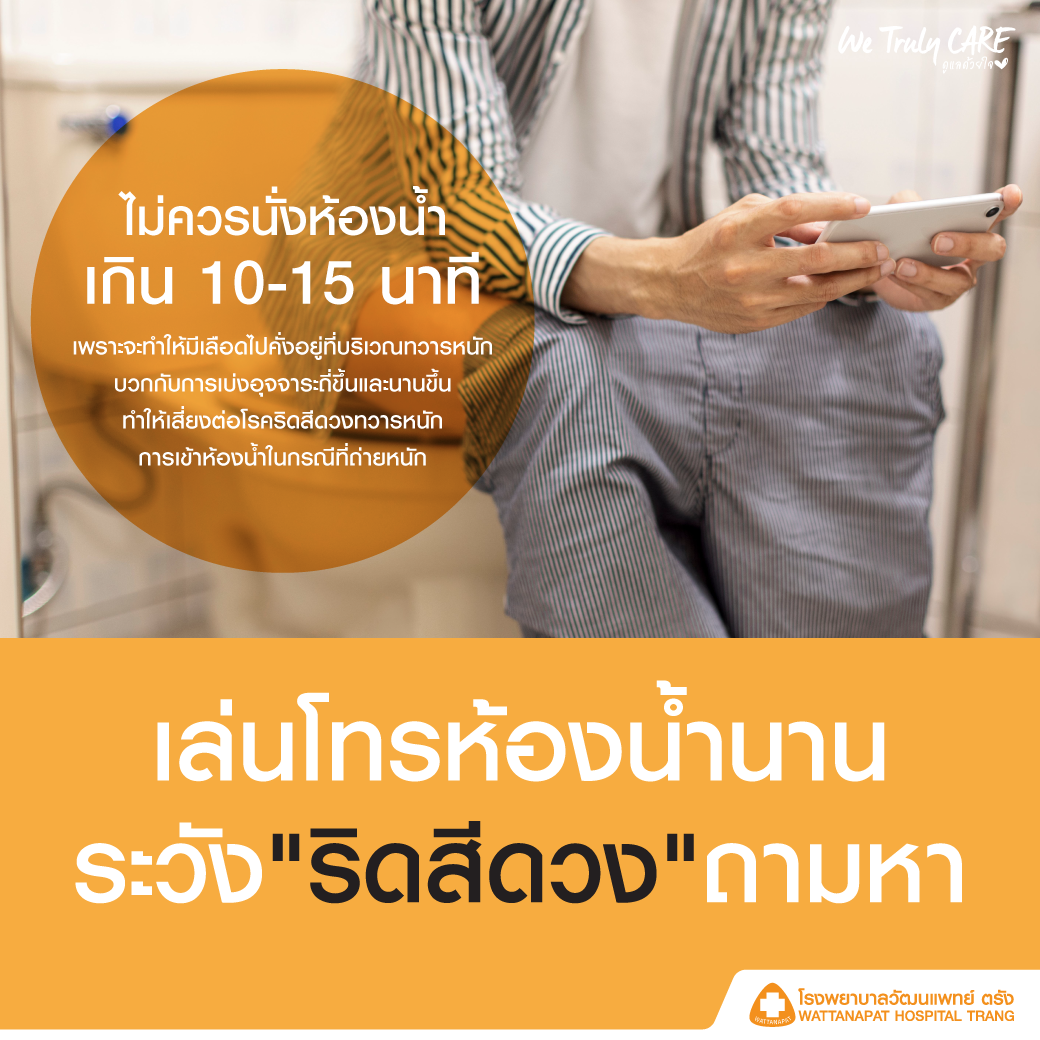 การเล่นโทรศัพท์ขณะนั่งส้วมทำให้เราสนใจแต่หน้าจอมือถือ มากกว่าการขับถ่าย ซึ่งอาจทำให้การเคลื่อนตัวของของเสียในลำไส้หยุดชะงัก แล้วไหลกลับไปคั่งอยู่ในร่างกาย ส่งผลให้เกิดอาการท้องผูกได้ หากใช้เวลาในห้องน้ำนานเกิน 15 นาที จะเสี่ยงต่อการเกิดโรคริดสีดวงทวารเพิ่มขึ้น ดังนั้นควรเข้าห้องน้ำเมื่อรู้สึกปวดถ่ายจริงๆ แทนการนั่งเล่นมือถือค่ะ