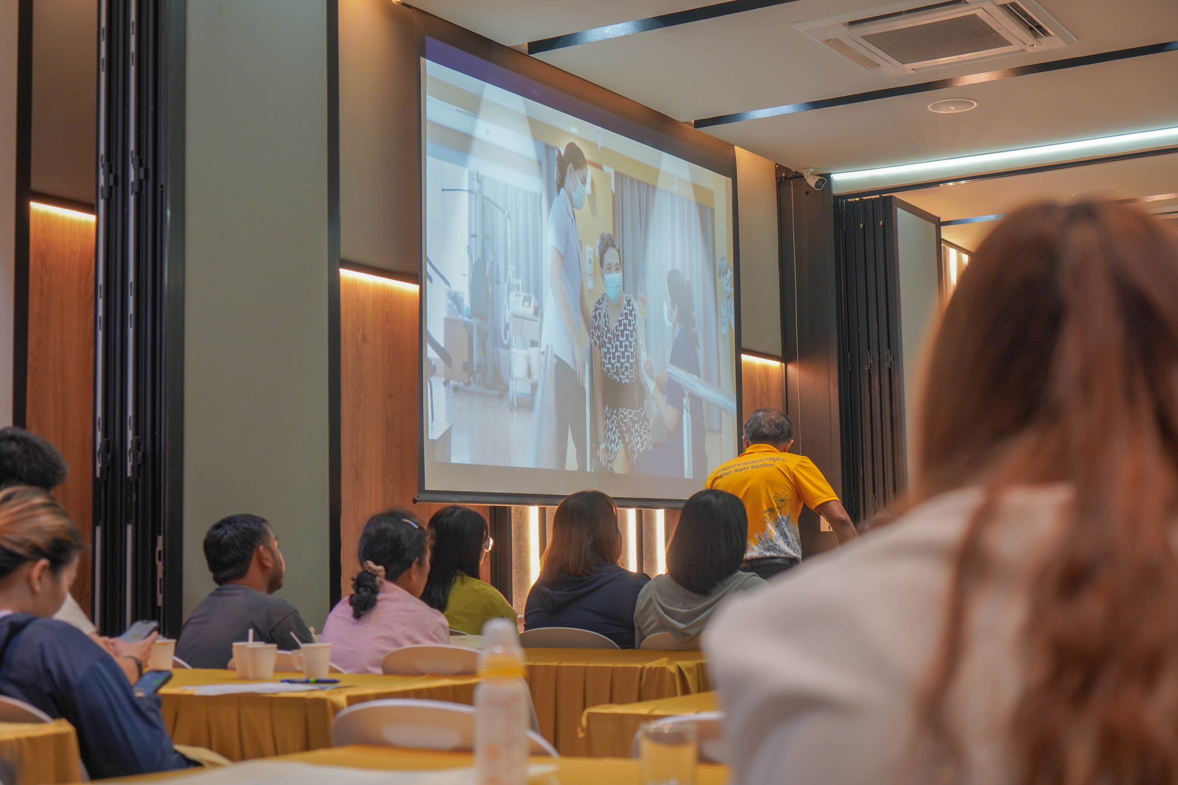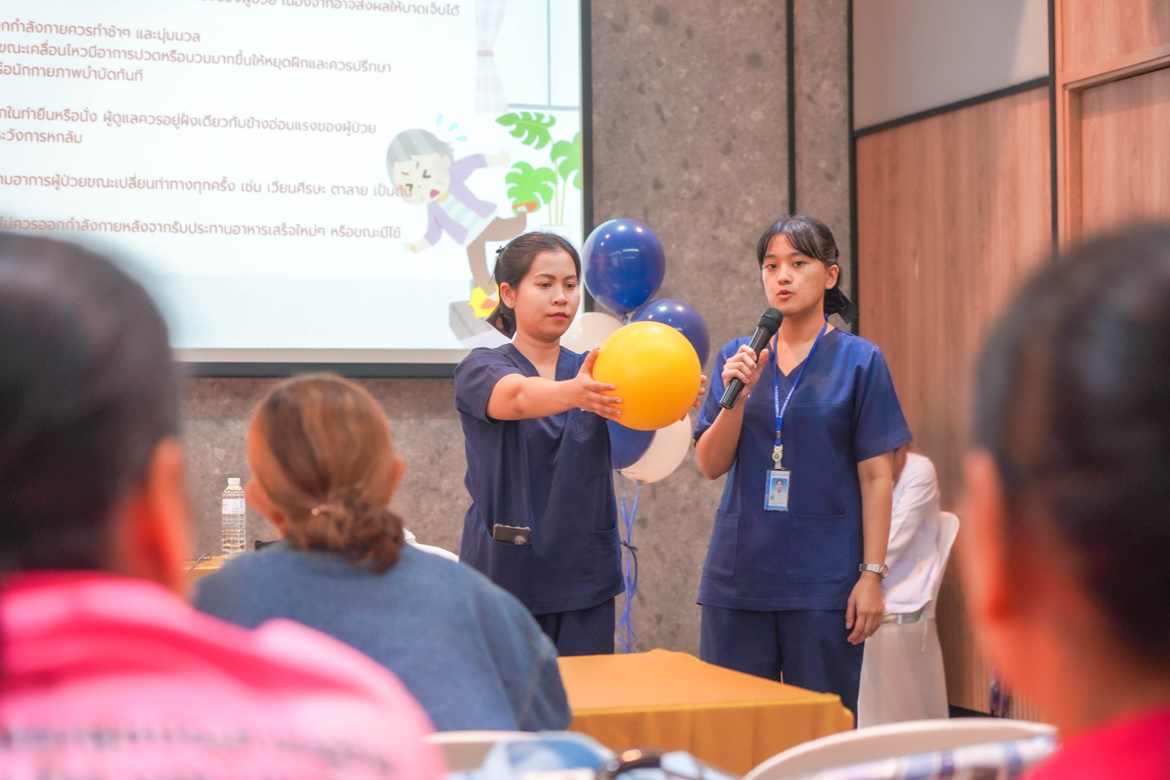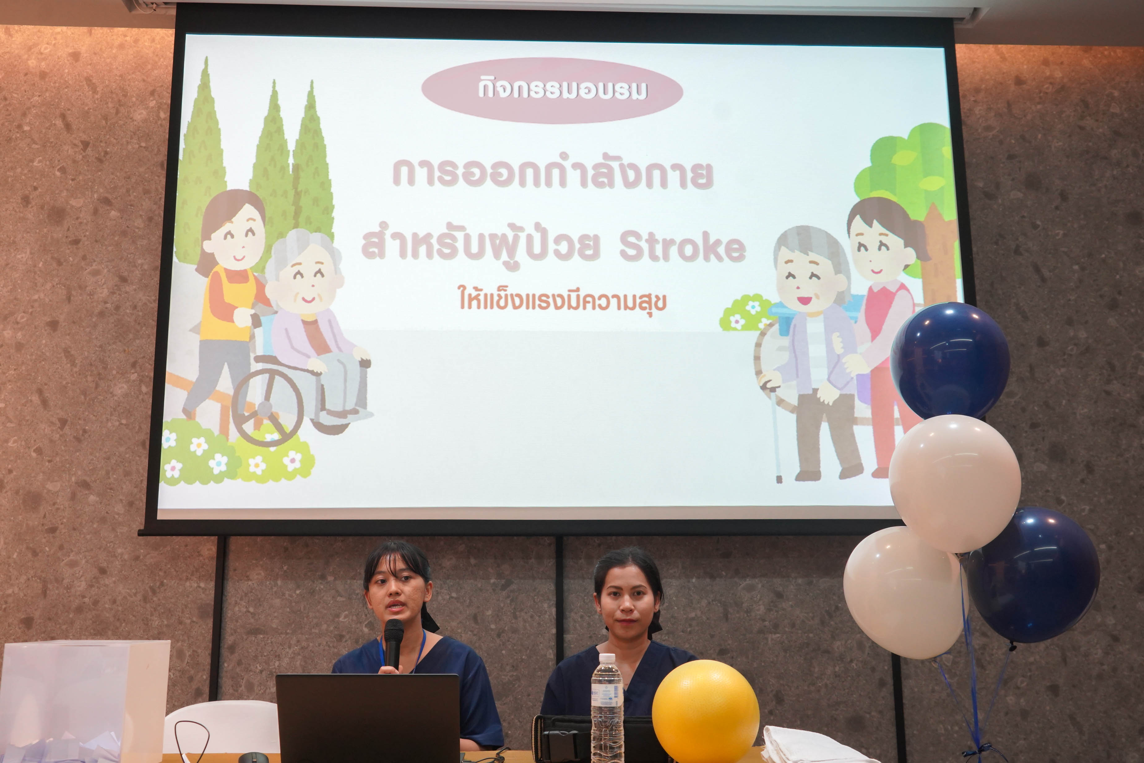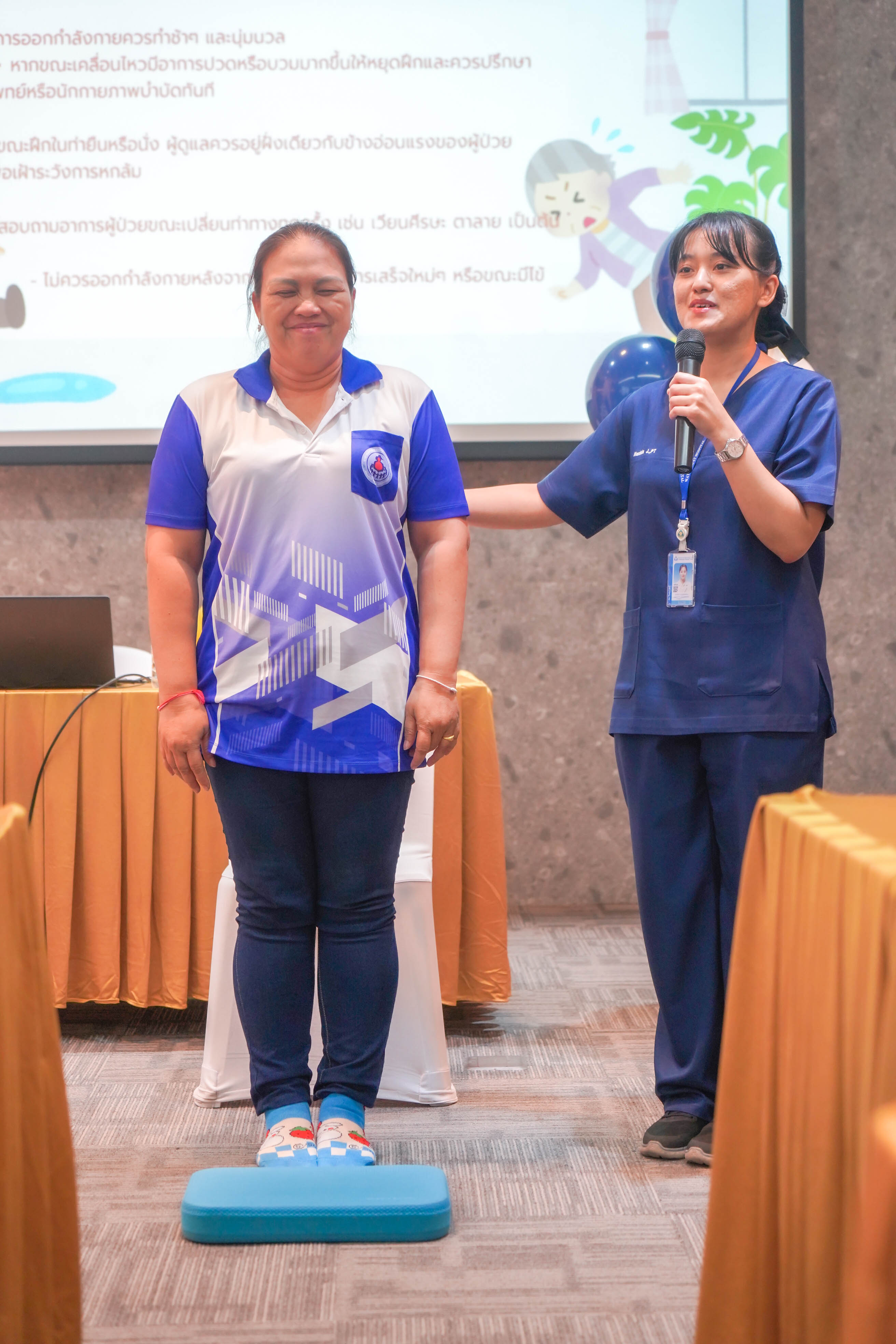 นอกจากการบรรยายให้ความรู้แล้ว ผู้เข้าร่วมยังได้ร่วมกิจกรรม Workshop ฝึกท่าทางกายภาพบำบัด กับทีมผู้เชี่ยวชาญ เพื่อเรียนรู้วิธีช่วยเหลือตัวเองและดูแลผู้ป่วยโรคหลอดเลือดสมองได้อย่างถูกต้อง