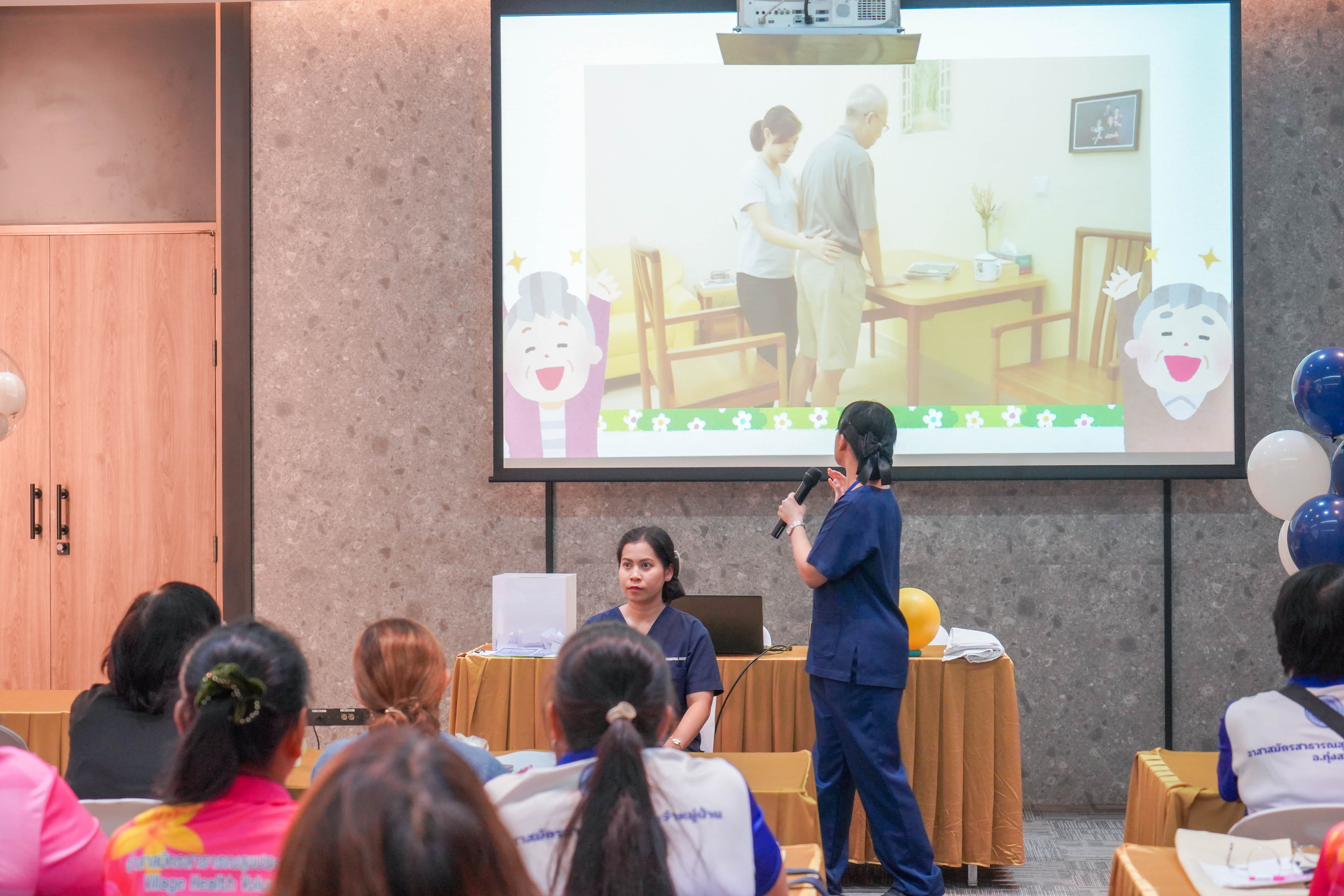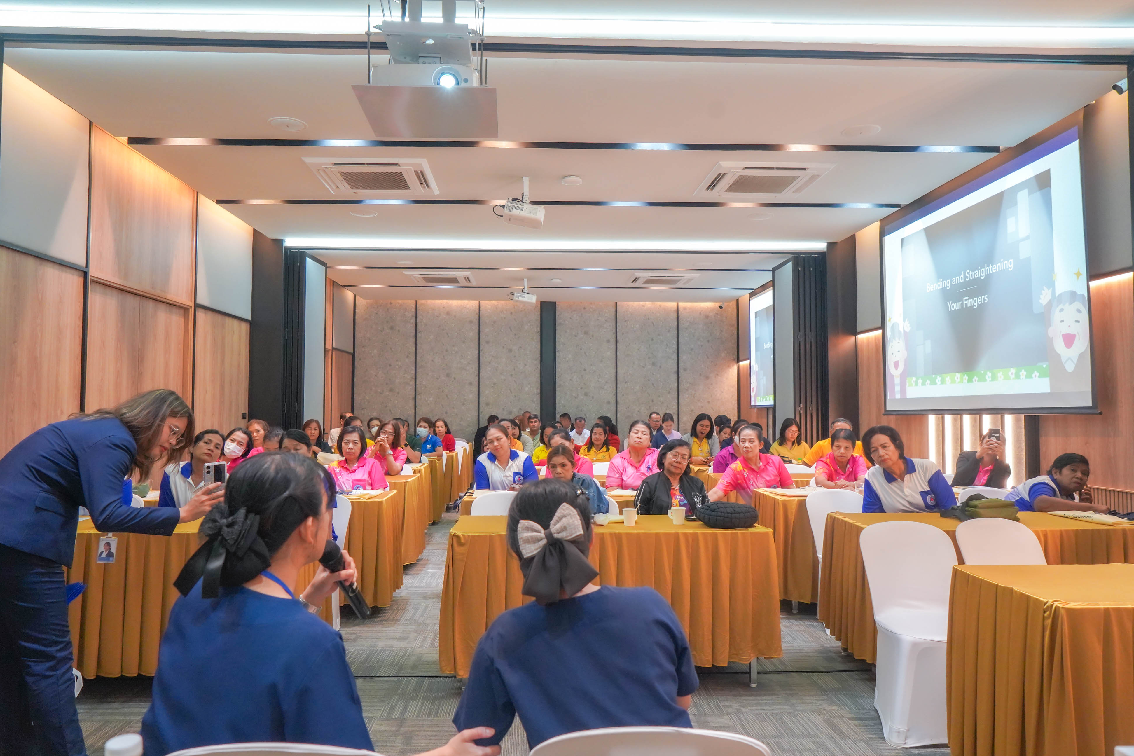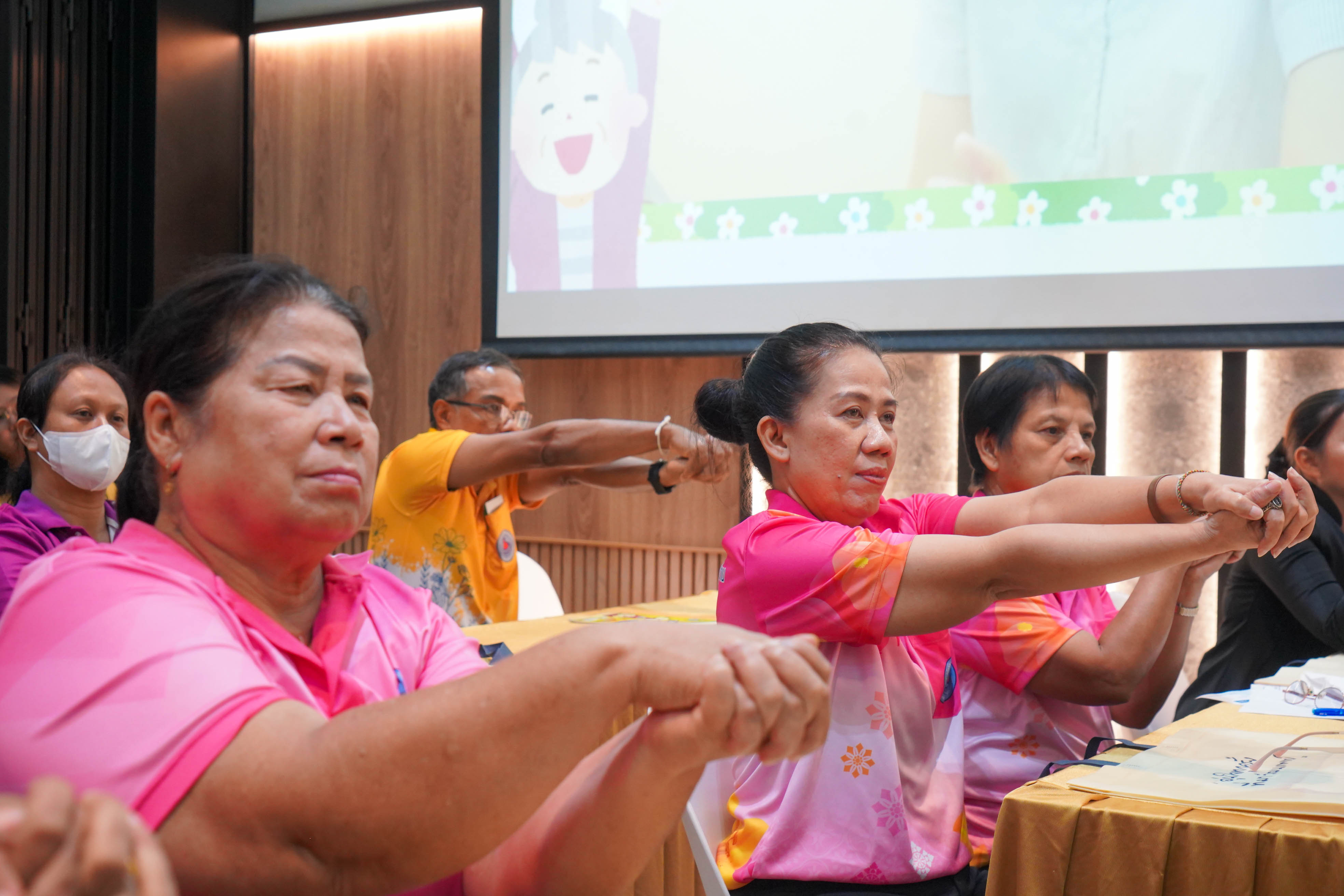 นอกจากการบรรยายให้ความรู้แล้ว ผู้เข้าร่วมยังได้ร่วมกิจกรรม Workshop ฝึกท่าทางกายภาพบำบัด กับทีมผู้เชี่ยวชาญ เพื่อเรียนรู้วิธีช่วยเหลือตัวเองและดูแลผู้ป่วยโรคหลอดเลือดสมองได้อย่างถูกต้อง