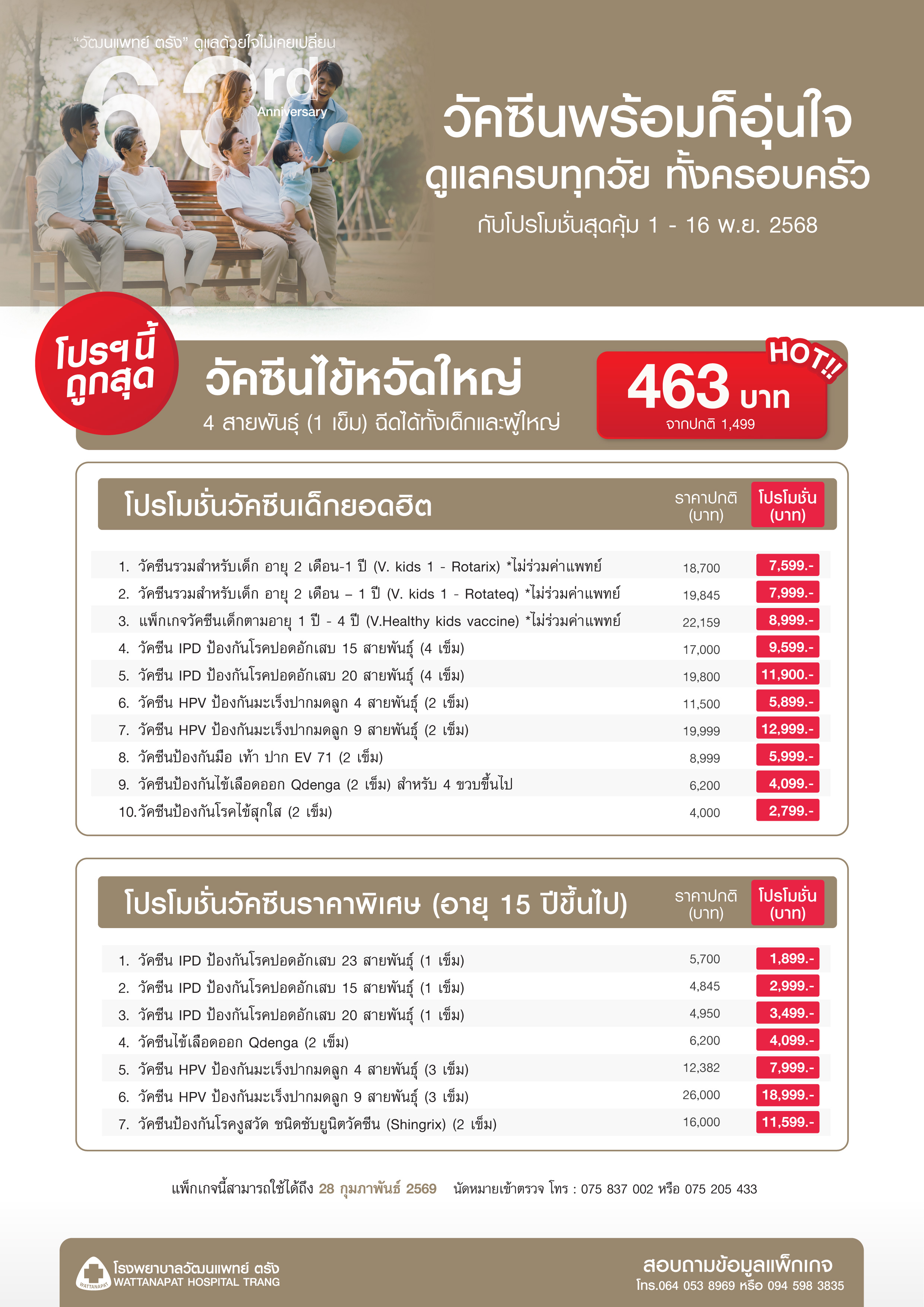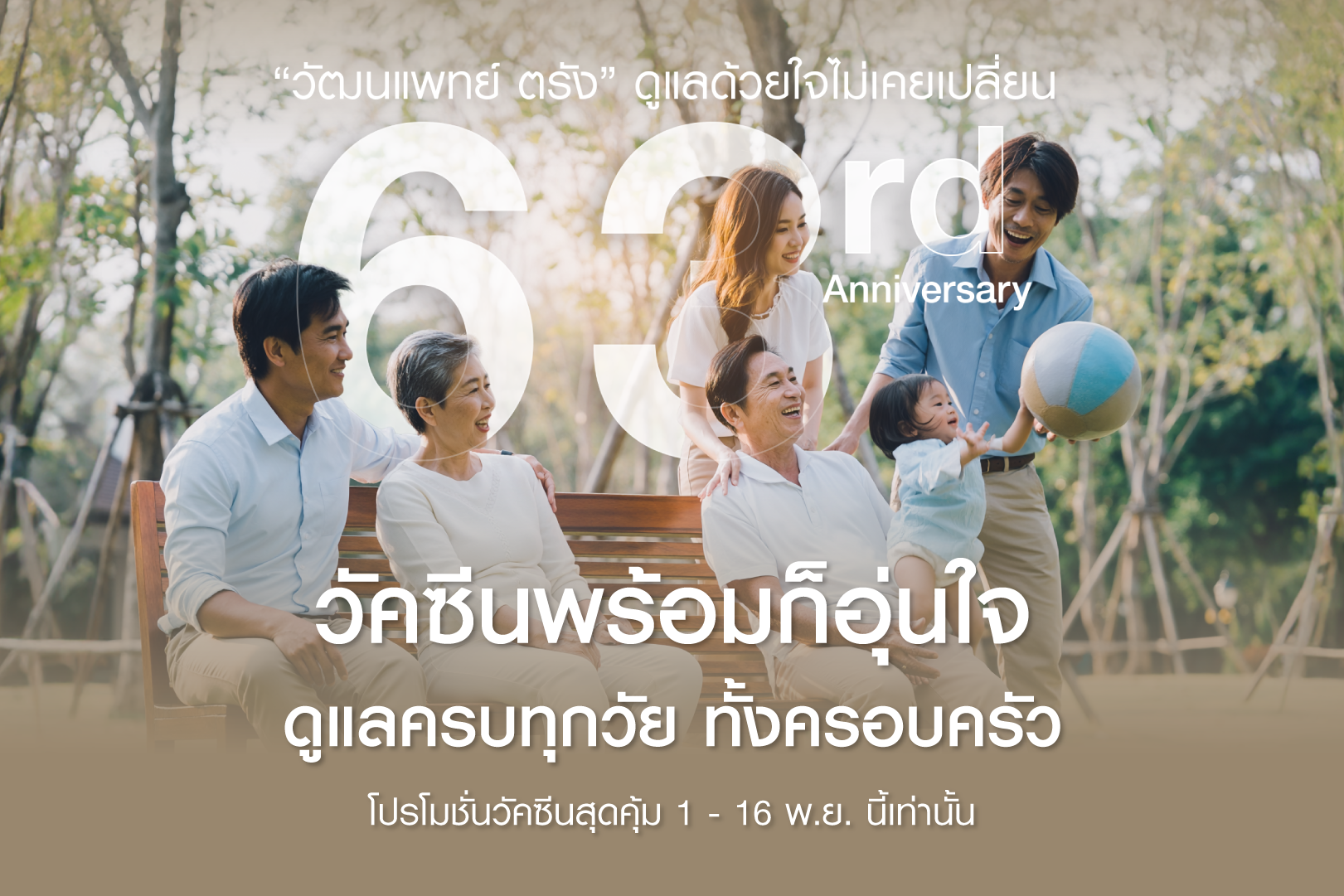 โปรโมชั่นครบรอบ 63 ปี วัฒนแพทย์ ตรัง แพ็กเกจวัคซีนป้องกัน อุ่นใจ ทั้งครอบครัว